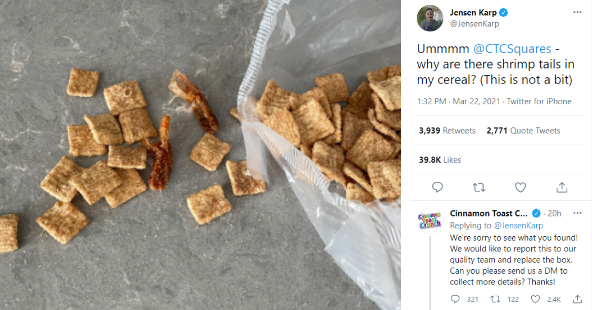 This week, writer and podcaster Jensen Karp uploaded an image to Twitter of what he found in his box of Cinnamon Toast Crunch—shrimp tails.