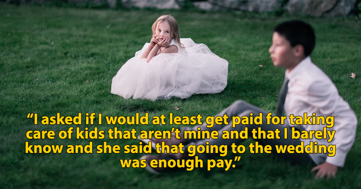 “Today, my friend texted me and told me that I might have to go to the wedding. When I asked her why, she told me it would be to take care of the guests’ children. I thought she was joking but then she insisted that she was serious. I asked if I would at least get paid for taking care of kids that aren’t mine and that I barely know and she said that going to the wedding was enough pay.”