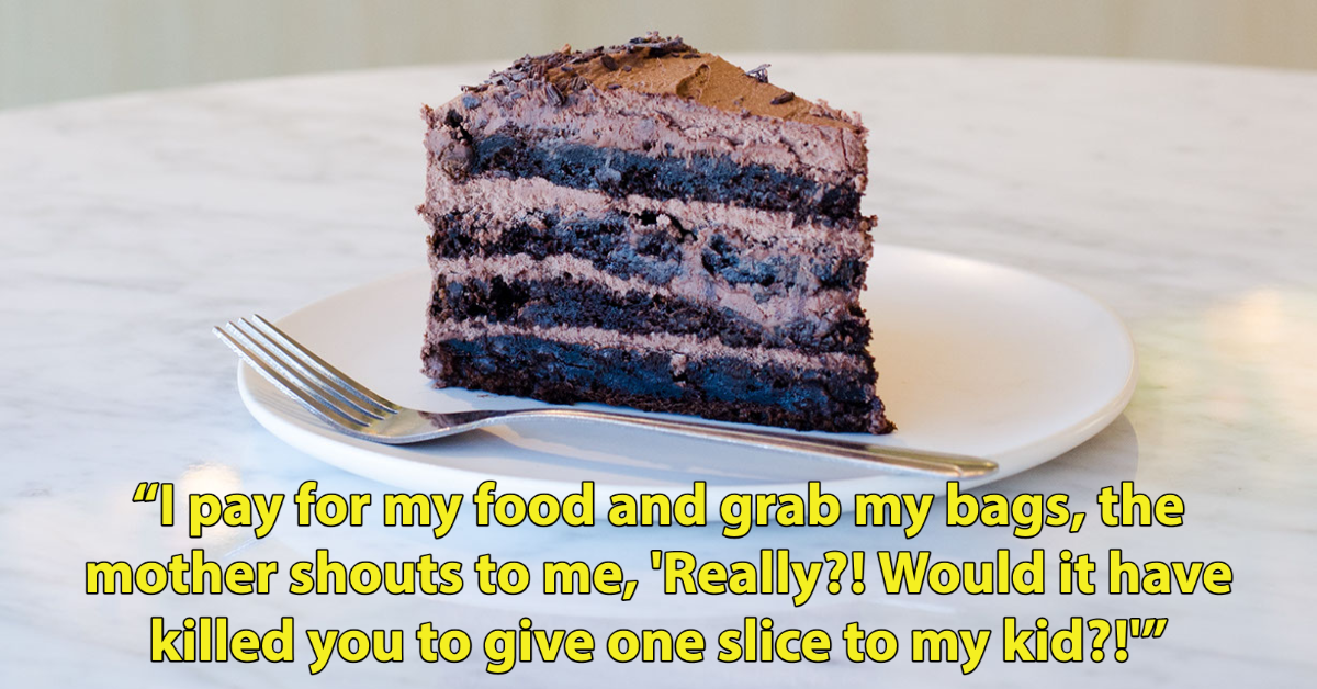“Then I’m putting the items up on the register, kid sees the cakes, shrieks/cries ‘there they are! Make her give them to me!’ The mother said ‘no that belongs to the lady’ then the kid starts to scream like a banshee, melts down to the floor, I try to ignore them and not make eye contact. I pay for my food and grab my bags, the mother shouts to me ‘really?! Would it have killed you to give one slice to my kid?! I’m a single mother!!!!!’