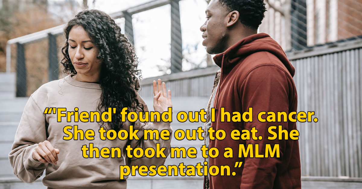 “I had a very close friend in high school, she moves to Alabama for uni after we graduated, but we kept close! When she came back we didn’t talk much, but I still considered her a close friend. We went out for coffee about two years ago, she kept asking me about my life and my goals and I said I was happy where I am (I coach gymnastics) and my boyfriend and I will eventually take over his family farm, and start our own family. She texted me two days later and said ‘hey so my entrepreneur friend is hosting a workshop, do you want me to sign you up?’ I said no but thanks for the offer, she then texted me ‘so clearly we are at two different points in our lives, you have no goals, or ambitions, and I don’t want that kind of negativity in my life. I wish you the best’ and I never spoke to her again.” — chazzieboii