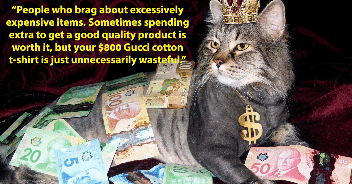“People who brag about excessively expensive items. Sometimes spending extra to get a good quality product is worth it, but your $800 Gucci cotton t-shirt is just unnecessarily wasteful.” — ablondedude