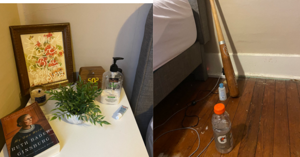 Next, we see her boyfriend’s side of the bed. On his side is a baseball bat, empty Gatorade bottle, a bottle of lube, and a couple cords. Cute?