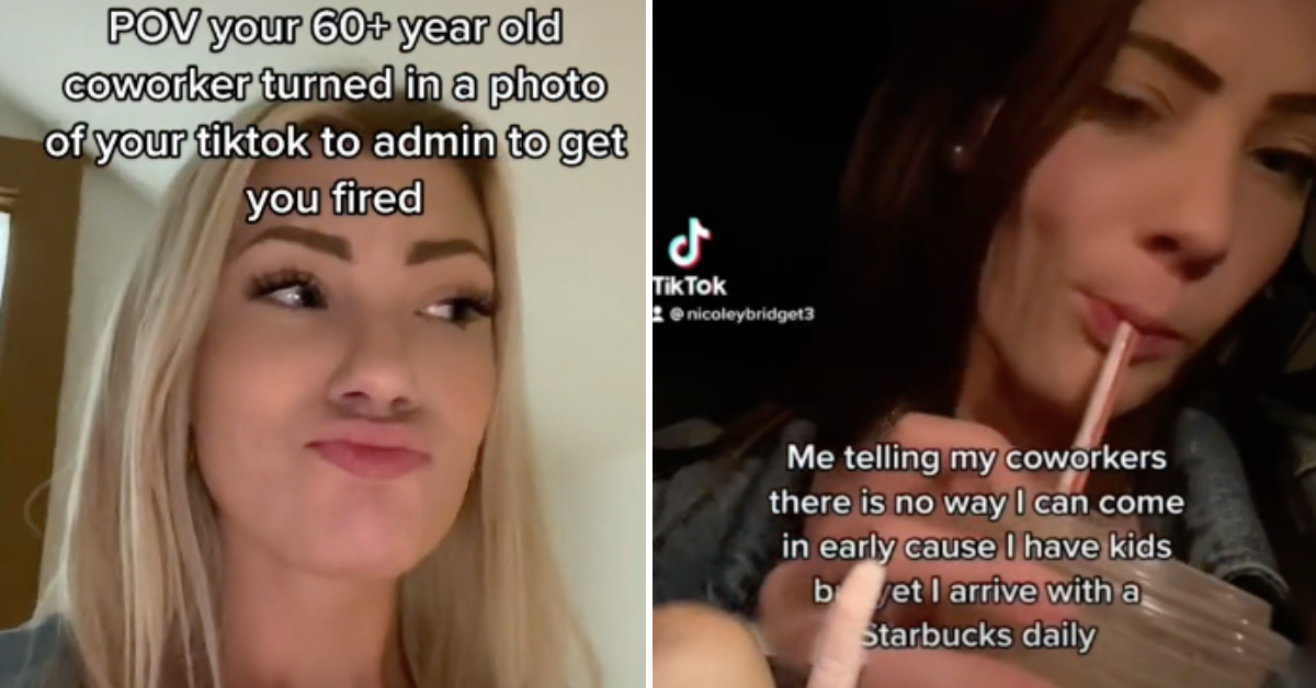 “POV your 60+-year-old coworker turned in a photo of your TikTok to admin to get you fired,” the video’s on-screen text says.