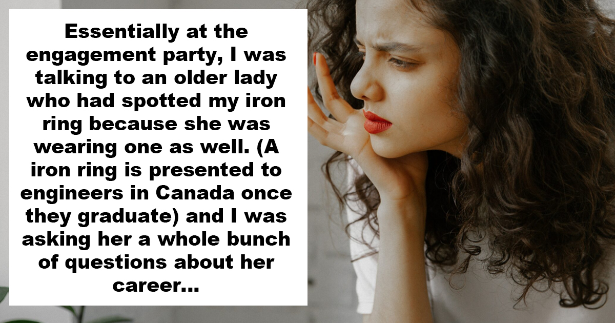 Essentially at the engagement party, I was talking to an older lady who had spotted my iron ring because she was wearing one as well. (A iron ring is presented to engineers in Canada once they graduate) and I was asking her a whole bunch of questions about her career, which field of engineering shes in etc. Turns out she was Nell’s future MIL’s sister then Nell and Alex came over to say hi and I congratulated them both. Then Nells MIL’s sister and I continued our conversation and then Nell spoke up and said “Uhm, why are you lying about being an engineer? Don’t you work at victorias secret or something?” And I was like “Yeah I used to work at victorias secret when I was in Uni but now I work as a Software engineer” and then Nell started laughing a bit and said “No you don’t, stop lying” and everyone visibly got really awkward.